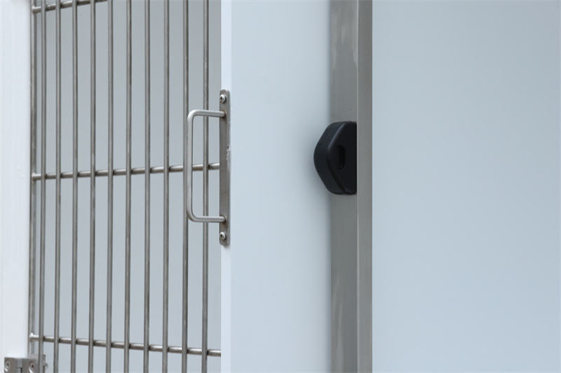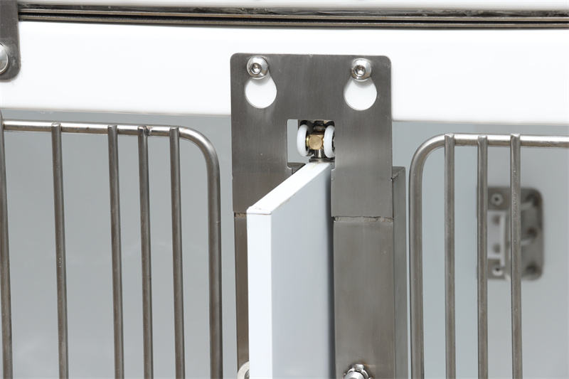 Förinstallerade spraymunstycken och slangar, ett dräneringssystem med filter och eluttag förvandlar det från att bara hålla i bur till en multifunktionell arbetsstation. Elektrisk utrustning som anestesiapparater, syrgaskoncentratorer och värmekuddar kan kopplas in i uttagen och hängas upp från dörrens centrala tvärbalk. Veterinärvattentät modulär hundburs ytterdörr i glasfiber tillåter installation av solskydd via U-formade böjar, vilket blockerar solljus samtidigt som den fungerar som en vindbarriär.
